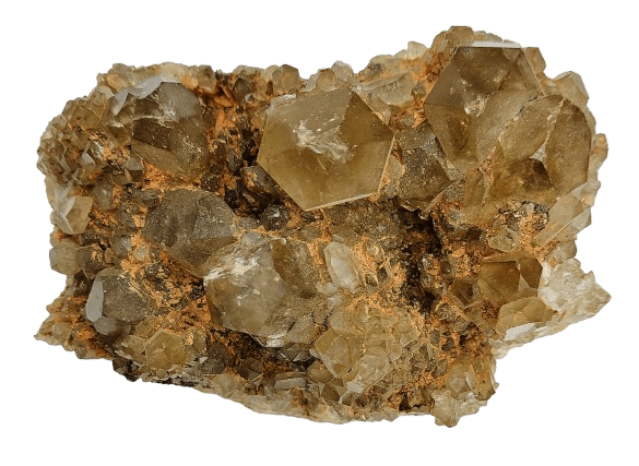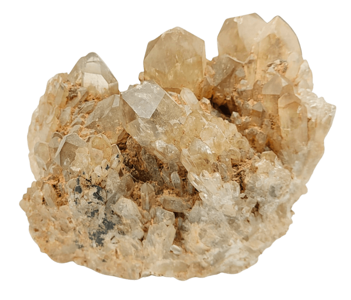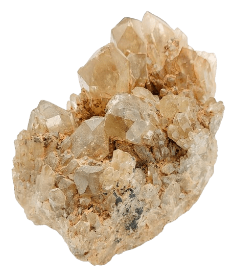 β Composition: A captivating cluster of citrine crystals (yellow to golden) beautifully perched on a raw stone base, showcasing nature’s intricate formations.